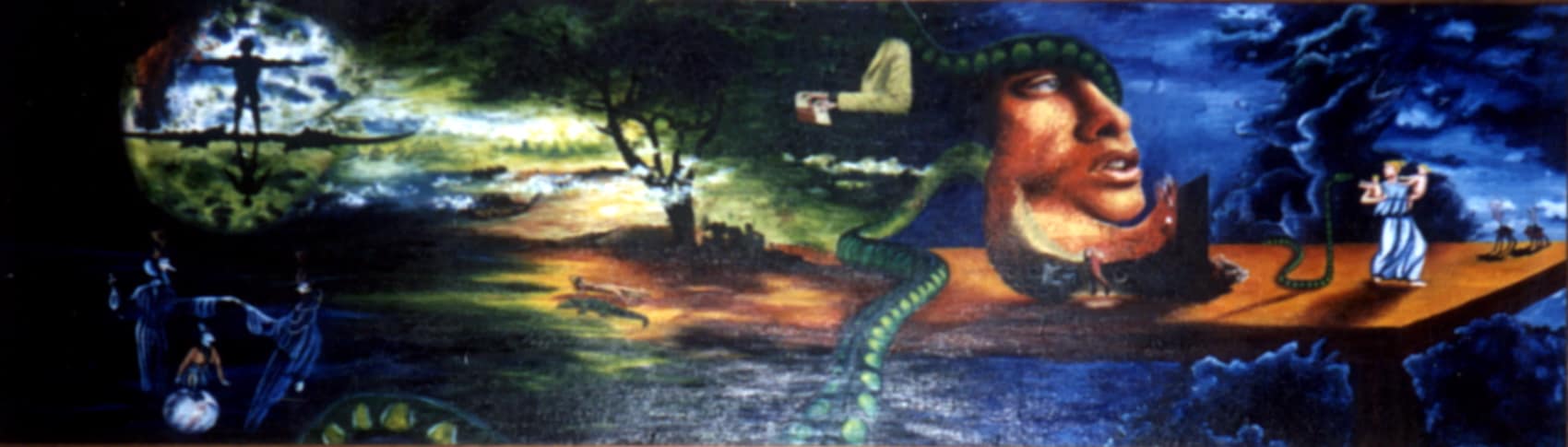 I painted this on the side of my bed, which had a large wood panel. It took me about a year to finish. It was my second or third painting I ever made. It is a mélange of images and scenes from my imagination and photos. As you can see, I was very much influenced by the band The Doors.